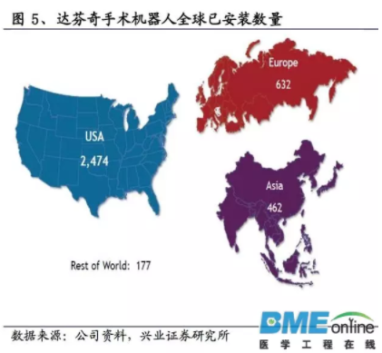 截至2017年6月,全球共有4149臺達芬奇,亞洲的數(shù)量占13%