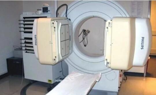 照片中的便是SPECT成像系統(tǒng),在患者診斷床的上方是SPECT成像系統(tǒng)的兩個探測器,它們重達660磅重,是可以沿著機架在患者上方旋轉的。