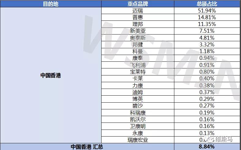 中國香港市場為中國心電圖出口第三大市場,共計(jì)25家出口商,占全年心電圖出口8.84%的份額, 其中深圳邁瑞在中國香港市場占有率高達(dá)51.94%。