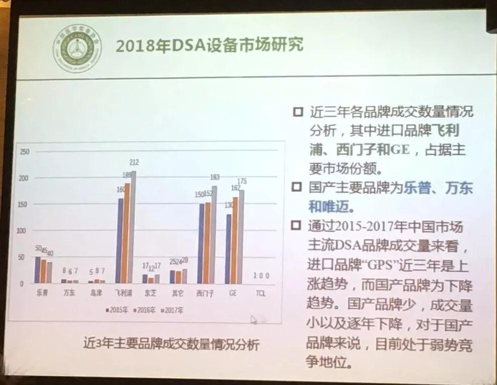 根據(jù)近3年主要品牌成交數(shù)量情況分析,目前國(guó)內(nèi)DSA市場(chǎng)主要為飛利浦、西門(mén)子和GE掌控,“GPS”三家的成交量呈逐年上漲趨勢(shì)。國(guó)產(chǎn)DSA廠(chǎng)家目前有主要包括樂(lè)普、萬(wàn)東和唯邁,基本處于弱勢(shì),成交量少,并且年銷(xiāo)售量呈下降趨勢(shì)。