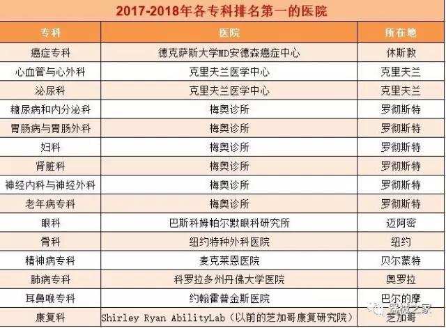 在醫(yī)療界梅奧診所就是傳說中的麥加,世界頂尖的醫(yī)療機構。2017年8月8日,《美國新聞與世界報道》公布了2017-2018美國最佳醫(yī)院排行榜,梅奧診所以415分的總分再次榮登榜首,并在糖尿病和內分泌??啤⑽改c科、婦科、腎臟科、神經??坪屠夏瓴W六個??浦信琶谝弧?/span>