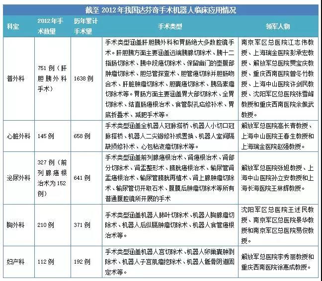 1、國(guó)內(nèi)手術(shù)機(jī)器人在泌尿外科、普外科、胸外科、婦產(chǎn)科及心臟外科的臨床應(yīng)用不斷提升;