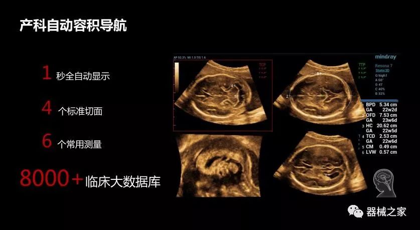 基于臨床大數(shù)據(jù)算法,女媧Resona 8在取得胎兒顱腦三維數(shù)據(jù)后,1秒的時間就可以直接顯示4個標準切面并進行6個常用的測量。