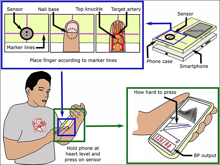 目前這項(xiàng)研究有了新的進(jìn)展,來(lái)自密歇根州立大學(xué)和馬里蘭大學(xué)的研究人員發(fā)明了一種可以集成到智能手機(jī)的血壓傳感器,只需按壓指尖即可完成血壓測(cè)量。