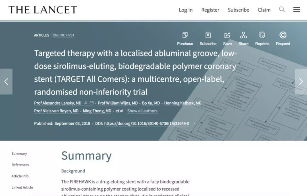 2018年9月,一項(xiàng)由10個(gè)國(guó)家和地區(qū)21家機(jī)構(gòu)聯(lián)合參與的一項(xiàng)大型臨床試驗(yàn)成果,首次刊登在《柳葉刀》上,這項(xiàng)試驗(yàn)證實(shí):中國(guó)自主研發(fā)的心臟冠脈藥物洗脫支架“火鷹”(FIREHAWK),使用了最少的藥劑量,因而獲得了最高的安全性,而同時(shí)在療效上與國(guó)際頂尖的XIENCE支架媲美。