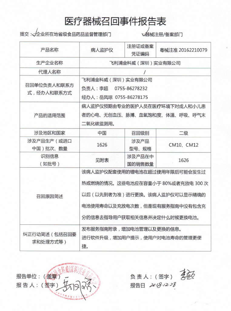 2018年,飛利浦也曾發(fā)布了多起對病人監(jiān)護儀的召回,其中一份召回報告也是二級召回,涉及到2672臺監(jiān)護儀,同樣是通過監(jiān)控內部產品投訴發(fā)現,存在鋰離子電池超過預期使用壽命后發(fā)熱或燃燒風險。