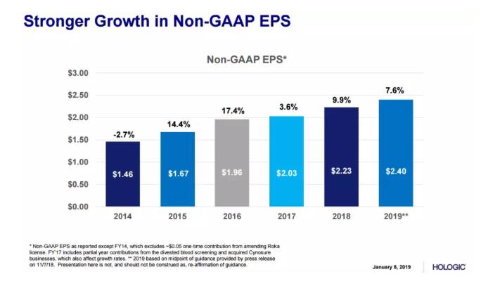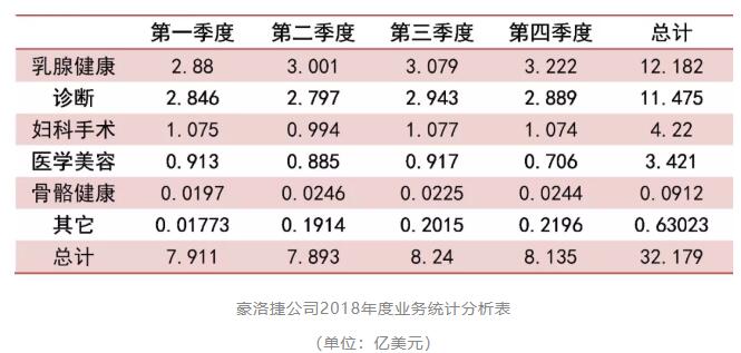 2018年第四季度,豪洛捷公司總營收收入為8.135億美元,同比增長1.3%,每股收益0.58美元。第四季的收入增長主要由乳房健康、分子診斷和國際業(yè)務(wù)三塊驅(qū)動(dòng)。其中,乳腺健康業(yè)務(wù)收入為3.222億美元,同比增長7.4%;診斷業(yè)務(wù)總收入為2.889億美元,占比35.51%,同比增加3.4%;婦科手術(shù)收入為1.074億美元,同比增加3.1%。