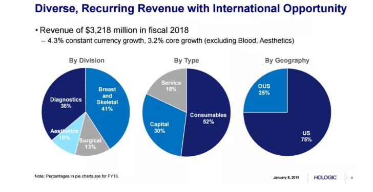 近五年來,豪洛捷財(cái)務(wù)增長穩(wěn)健。2018年,豪洛捷公司實(shí)現(xiàn)收入32.179億美元,利潤增長強(qiáng)勁,每股凈收益EPS達(dá)2.23美元。其中,乳腺健康和診斷業(yè)務(wù)始終有不俗表現(xiàn)。盡管醫(yī)學(xué)美容業(yè)務(wù)受到FDA相關(guān)政策的影響,但豪洛捷以16.5億美元收購Cynosure的大動(dòng)作表明了它進(jìn)軍醫(yī)療美容界的野心。產(chǎn)品、服務(wù)和資本收入三足鼎立。從地域來看,豪洛捷的市場主要還是集中在美國,國際化的潛力巨大。