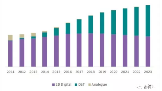 在過去的兩年中,DBT的應(yīng)用使乳腺X線攝影市場經(jīng)歷了快速增長。在早幾年前引入報銷制度后,這一趨勢在美國尤為明顯,2017年達到頂峰。