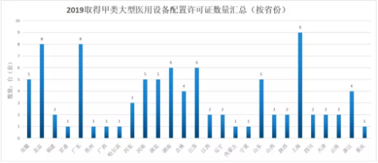 除海南、西藏、新疆外,全國27個省級行政區(qū)域都取得了1-8臺甲類大型醫(yī)用設(shè)備配置許可證。