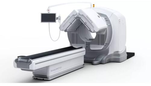 照片中的便是SPECT成像系統(tǒng),在患者診斷床的上方是SPECT成像系統(tǒng)的兩個探測器,它們重達660磅重,是可以沿著機架在患者上方旋轉的。