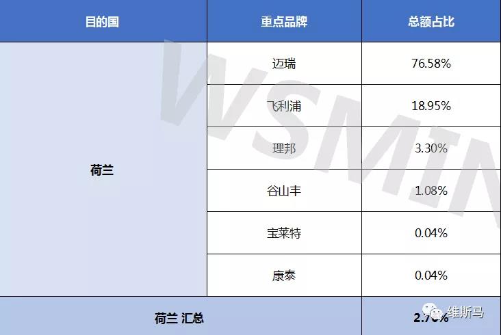 荷蘭市場為中國心電圖出口第七大市場,共計(jì)6家出口商,占全年心電圖出口2.76%的份額。其中深圳邁瑞在荷蘭市場占有率高達(dá)76.58%。