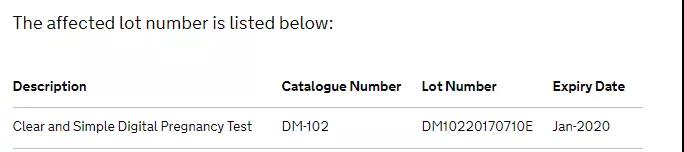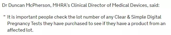 譯:MHRA醫(yī)療器械的臨床主任鄧肯·麥克弗森博士說:人們要重點(diǎn)檢查他們購買的任何清晰和簡(jiǎn)單的數(shù)字妊娠測(cè)試的批號(hào),看看他們是否有來自受影響批號(hào)的產(chǎn)品。