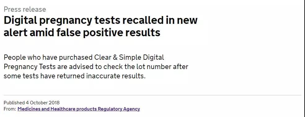 據(jù)BBC、《衛(wèi)報(bào)》、美國CNN等多家媒體報(bào)道,英國驗(yàn)孕棒品牌Clear&Simple的一批已售出的電子驗(yàn)孕棒中,至少有58000名英國顧客的驗(yàn)孕結(jié)果可能出現(xiàn)“假陽性”,而這其中的大部分的女性很有可能根本沒有懷孕。這一數(shù)字在隨后的英國《電訊報(bào)》的報(bào)道中增加至60000人。
