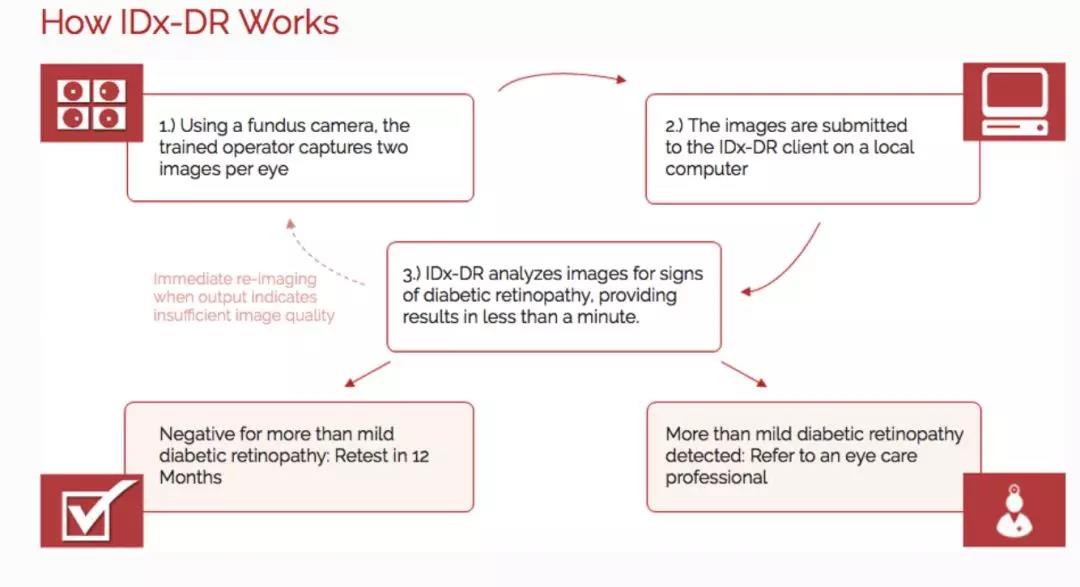 與預(yù)約真人醫(yī)生相比,IDx-DR 真的是太方便簡(jiǎn)單了,只需要護(hù)士或者醫(yī)生通過(guò)使用特殊的視網(wǎng)膜照相機(jī)拍下患者的視網(wǎng)膜照片,隨后按照 IDx-DR 軟件的指示上傳圖像,并確定圖像的質(zhì)量是否足夠獲得分析結(jié)果。如果圖像合格,軟件將自動(dòng)分析(無(wú)須專業(yè)醫(yī)生參與)患者是否患有糖尿病性視網(wǎng)膜病變,并將根據(jù)結(jié)果診斷并決策后續(xù)治療。