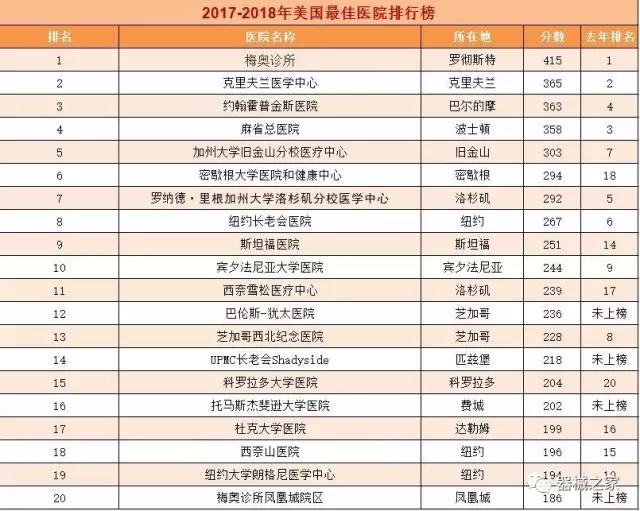 在醫(yī)療界梅奧診所就是傳說中的麥加,世界頂尖的醫(yī)療機構。2017年8月8日,《美國新聞與世界報道》公布了2017-2018美國最佳醫(yī)院排行榜,梅奧診所以415分的總分再次榮登榜首,并在糖尿病和內分泌??啤⑽改c科、婦科、腎臟科、神經??坪屠夏瓴W六個??浦信琶谝弧?/span>