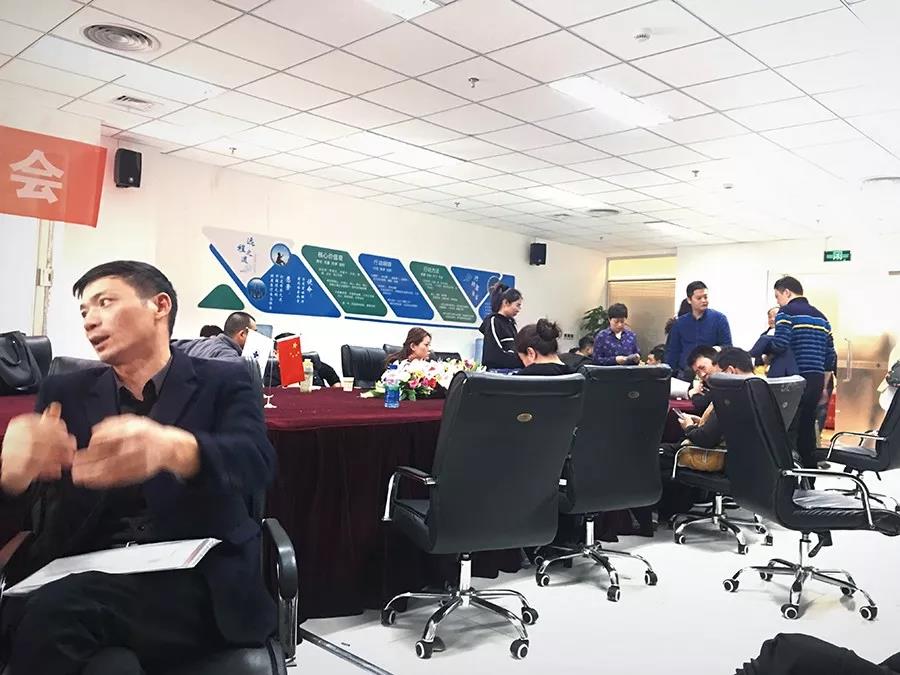 (2018年4月10日10時(shí)36分,來(lái)自各地的代理商聚集在遠(yuǎn)程視界辦公區(qū)內(nèi),要求退還代理費(fèi)。攝影/《財(cái)經(jīng)》記者 張利)