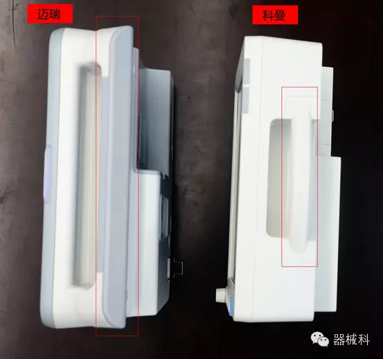科曼與邁瑞因機(jī)身尺寸上有區(qū)別,所以手柄方面,科曼明顯比邁瑞要小??坡捎么蠡《龋尸F(xiàn)橢圓截面的設(shè)計(jì);邁瑞采用方形小圓角,折疊活動(dòng)式的提手,塑膠包裹。手柄嬌小,不利于握持,但重心集中,更穩(wěn)定;手柄碩大,活動(dòng)范圍廣,卻也容易晃動(dòng)。