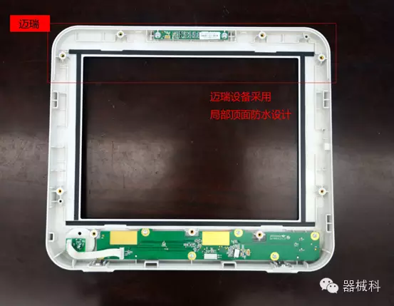 防水是所有電子類(lèi)產(chǎn)品的一個(gè)重要功能。如果防水功能設(shè)計(jì)不好,儀器很容易受潮,從而引起使用不便,嚴(yán)重的將會(huì)報(bào)廢??坡昂髿ぶg采用硅膠密封線整圈的防水設(shè)計(jì),做工更麻煩,耗材多,但更安全;邁瑞前后殼之間采用硅膠密封線頂部的局部防水設(shè)計(jì),省時(shí)省料,但存在安全隱患。