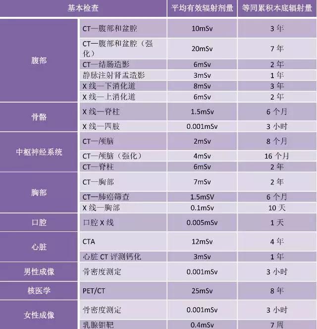臨床中,常會遇到患者在影像檢查前問醫(yī)生,是否有輻射,有多大的輻射呢?下圖是ACR,RSNA等組織聯(lián)合制定的常見影像學檢查平均輻射劑量的參考值,或許可以為你更好的回答患者的問題提供借鑒。
